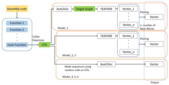 The following models(Table 2 and Table 3) are used in the experiments (Figure 5). All these models take as input the CFG of the calling expanded main function in each assembly file.