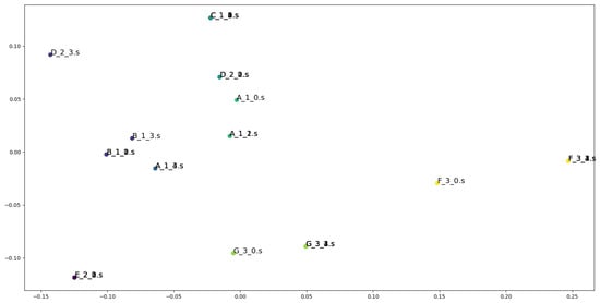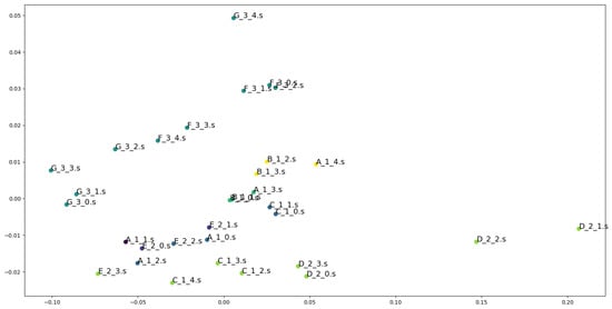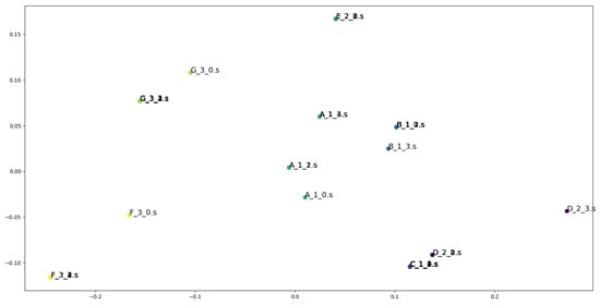 Figure 6, Figure 7 and Figure 8 visualize the most frequent results among the clustering results of Model_1, Model_3, and Model_4. Each representation vector is dimensionally reduced to two dimensions using principal component analysis, and plotted with coloring for each cluster. From the results of Model_4 and 5, Asm2Vec did not show a significant performance change between 500 and 2000 embedding dimensions, and Model_1, 2, and 3 outperformed the random-walk-based Asm2Vec in all indices for the same embedding dimensions. Comparison between Model_4 and Model_6 shows that increasing the number of random walk sequences improves performance, but increases the execution time roughly approximately inearly. Asm2Vec was used to retrieve the attributes in Model_1, and embedding by basic blocks can be performed in a shorter time than embedding from the whole CFG. Thus, applying graph embedding to CFGs for the classification of similar programs whose overall control flow is not significantly changed, as carried out in this experiment, is effective.