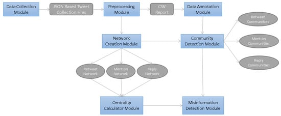 In this study, we propose a software architecture to be used in analyzing social network data (e.g., replies, mentions, and retweets) to study misinformation spreading patterns and influence-related network properties. The proposed process includes several modules: Data Collection, Data Preprocessing, Data Annotation, Network Creation, Centrality Calculator, Community Detection, and Misinformation Detection Modules, respectively. The proposed modules are depicted in