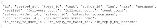 The data are stored in a folder with the name of the same day after all the tweets are downloaded from the tweet IDs for a day, using the JSON format. Storing the data in a single file for the day allows for easier processing of the data using the Python library. In this study, tweets regarding COVID-19 on 11 January 2021 were used. The Python script was run for the selected day, and all the JSON files in the folder were processed to generate a data report for that day. Any columns without a value were marked with a # sign to facilitate filtering operations on the data.