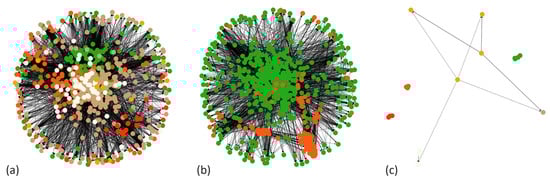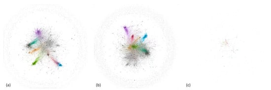 Figure 6 displays graphics created from the retweet, mention, and reply networks, which are color-coded according to communities.