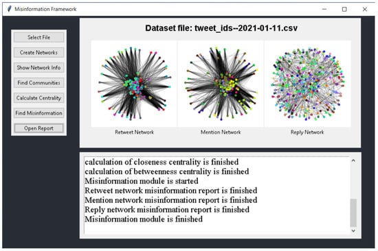 Figure 7 allows users to visualize the networks using the NetworkX application and analyze the centrality metrics and community structure of the networks using the implemented modules. The GUI also displays the results of the misinformation detection module, providing users with a clear understanding of the extent to which misinformation is being disseminated in the communities identified by the aforementioned metrics and algorithms. The availability of the GUI application on GitHub as an open-source project makes it easier for researchers and analysts to access and use the proposed framework, promoting transparency and reproducibility in data analysis [