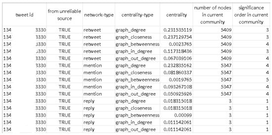 Figure 8. It is important to note that our work does not focus on misinformation detection, but we label twets based on iffy and also on the list on un-trusted sources that we have mentioned earlier. The first column presents the id of the evaluated tweet. The second column indicates whether the tweet in question was labeled as disinformation. The subsequent three columns display the network type established, together with the centrality metric’s type and the corresponding value computed within the respective network. The following two columns provide information on the community detection module. Specifically, they present the community affiliation of the tweet, the number of nodes inside that community, and the ranking of the tweet’s relevance based on the centrality metric within the respective community.