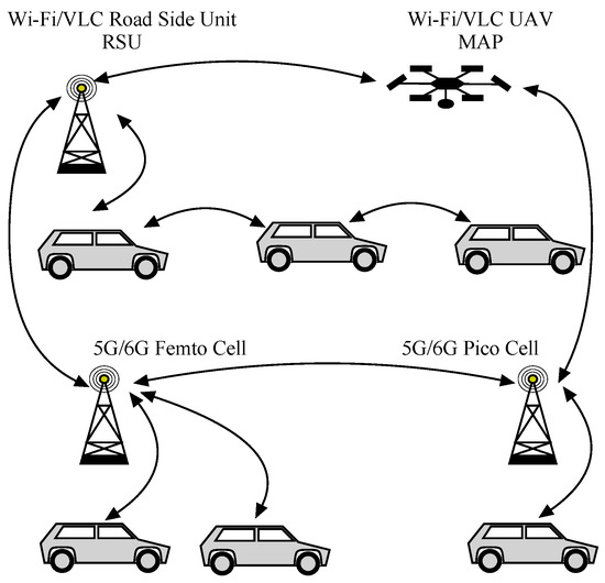 VAN system operating in 5G/6G cellular system model as well as an IEEE 802.11 Wi-Fi model. MAP: mobile access point, RSU: road-side unit, UAV: unmanned aerial vehicle, VLC: visible light communications.