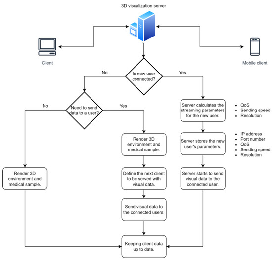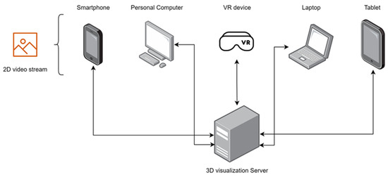 27]. Our system is built on a client–server architecture. This means that there is a central server that performs the computations related to the 3D visualization and transmits the results to the clients. The method of 3D display performed by the server is available in previous works [