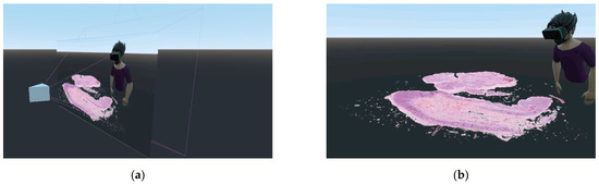 Figure 2, actual 3D rendering is performed “only” on the server side. Nevertheless, clients perceive it as if 3D rendering is happening on their device. We were able to achieve this effect by displaying a canvas directly in front of the users, displaying the image data received from the server. It is important to note that there is continuous two-way communication in our system. With this technique, the server is able to provide the image data, while the user is able to transmit, for example, his own motion data to the server. This is important because if the user’s motion data are transmitted to the server, the server can generate the new image data from the appropriate viewpoint. Even though the digitized medical samples are not stored on the client side and the 3D visualization is not performed on the client device, we were able to implement it in such a way that the user can walk around the 3D medical sample by continuous two-way communication. The result of the client-side visualization can be seen in