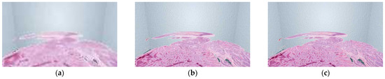 The result of the adaptive resolution changing image streaming. (a) The resulting image if the latency between the client and server is high. If the latency is high, the resolution of the streamed image is low (320 × 180). (b) The resulting image if the latency is in a medium range. If the latency is in a medium range, the streamed image will be at a medium resolution (960 × 540). (c) The resulting image if the latency between the client and server is low. If the latency is low, the resolution of the streamed image is high (1280 × 720).
