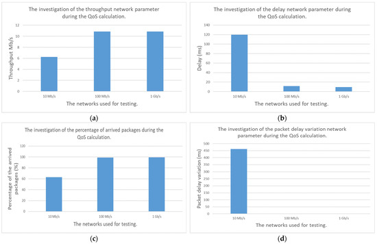 The results of the Quality of Service testing. (a) The result of the throughput investigation with different types of networks during the Quality of Service calculation. (b) The result of the delay investigation with different types of networks during the Quality of Service calculation. (c) The result of the investigation of the percentage of arrived packages with different types of networks during the Quality of Service calculation. (d) The result of the packet delay variation investigation with different types of networks during the Quality of Service calculation.