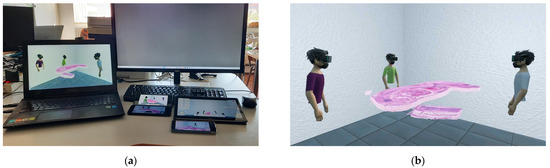 Using the presented software with 5 users. (a) Using the presented solution with multiple users. Different users connected to the 3D inspection environment on different devices, such as smartphone, tablet, laptop. (b) The video stream seen by the user using the laptop.