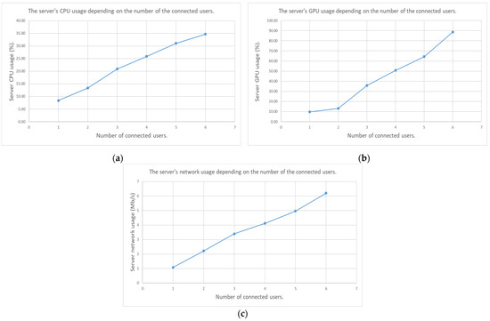 The test result of the hardware usage of our server application regarding the number of connected users. (a) The CPU usage of the server regarding the number of connected users. (b) The GPU usage of the server regarding the number of connected users. (c) The network usage of the server regarding the number of connected users.