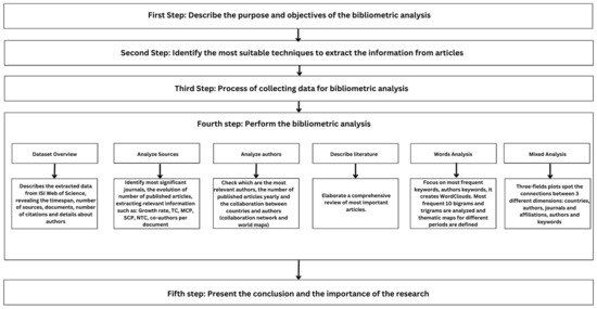 To offer a comprehensive exposition of our analytical process and methodologies, we have presented a graphical representation in Figure 1. We began with a description of our purpose in doing this work, which was to find out which works were the most significant in terms of the development of the field of cybernetics and the interest of researchers in it. We proceeded by building the database, selecting certain works, and applying filters to the titles, abstracts, or content level. Upon the curation of the database, we loaded the Bibliometrix package into the RStudio console window by using the biblioshiny( ) command [50]. In the document produced, we made different graphs that we interpreted with the help of specific indicators. A very important role was played by the creators of the research papers, their collaborators, as well as their preferences for various publications or what they wanted to document within the research area. We looked at what the production of the papers had been over time and identified the countries of origin with the help of thematic maps or the links between authors with the help of a collaborative network. The most cited papers found were rigorously analyzed, calculating indicators such as total citations (TC), total citations per year (TCY), or normalized TC, and then reviewed. We looked for the most relevant groups of words identified at title or abstract level, by illustrating a word cloud as well as an evolution over time of their usage. Furthermore, we illustrated three-field plots to show the different links existing between the most frequently used words, authors, countries of origin, or journals. Once the analysis was performed, in the last step of the paper we drew some conclusions, realizing once again how important the research field was to make certain discoveries.
