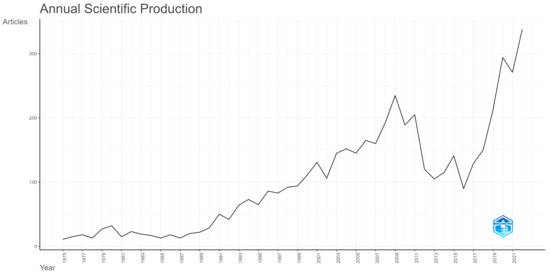 At the outset, our analysis was primarily oriented toward conducting an exploratory examination of the dataset. This initial phase aimed to provide a comprehensive overview, emphasizing critical aspects such as the number of sources, authors, and the temporal scope. Table 2 encapsulates the essential dataset statistics, encompassing a time frame commencing in 1975 and extending to 2022, inclusive of 1542 unique sources and a corpus of 4856 documents. The average publication year across these documents stands at 14.8 years. Furthermore, the dataset exhibits an average of 12.05 citations per document and an average of 1.194 citations per document per year, a small value compared with other domains. In total, there were 130,036 references, which shows how complex cybernetics is, which requires a lot of information from different areas.