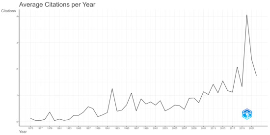 The metric of average citations per year is of paramount significance as it serves as an indicator of the papers’ utility in furthering scientific research. Figure 3 provides a comprehensive overview, commencing from the inaugural year of paper publication in 1975, where an initial average of 0.1 citations per year was observed. Subsequently, there was a notable uptick in these averages at the outset of the 1990s, culminating in 1992 with an average of 1.3 citations per year. Throughout the remaining analyzed period, the values exhibited considerable volatility, with a remarkable zenith recorded in 2020, representing the highest value of 4.1 citations per year.