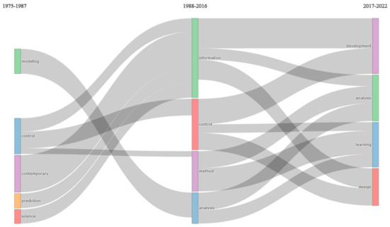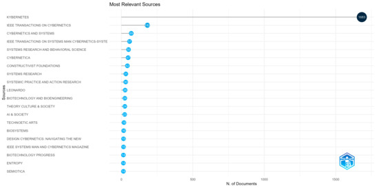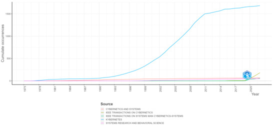 The analysis of the most prominent sources’ production trends from 1975 to 2022, as depicted in Figure 6, underscores “Kybernetes” as a pioneering journal in the field of Cybernetics, having published its first scientific article in 1977. Kybernetes has consistently stood out as the most influential journal in the Cybernetics domain, amassing a total of 1683 papers by the year 2022.