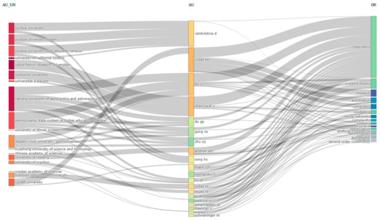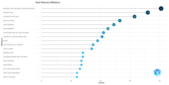 The affiliations associated with the most significant contributions in the Cybernetics domain are indeed noteworthy. Leading the list is Nanjing University Aeronaut and Astronaut with an impressive 81 articles, closely followed by Purdue University with 72 papers. Slippery Rock University has contributed 63 papers, while the University of Alicante has 53 articles to its credit. The University of Reading and University of Maribor have produced 49 and 45 articles, respectively, while Huazhong University of Science and Technology has 42 papers. Liverpool John Moores University follows closely with 41 scientific articles. The University of Paris has 35 articles, and the University of Wales Coll Cardiff and the University of Illinois have 34 papers each. The remaining affiliations within the top 18 have produced fewer than 30 articles each. For the full list of the affiliations and the number of articles, please refer to Figure 9.