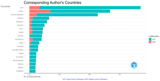 Figure 10 provides a comprehensive overview of the most influential countries in terms of authors who have published articles related to the Cybernetics domain. The United States of America stands at the forefront, with a total of 925 articles. Among these, 840 articles are Single Country Publications (SCPs), and 85 are Multiple Countries Publications (MCPs), accounting for a frequency of 19%. China follows closely with 672 papers, consisting of 495 SCPs and 177 MCPs, representing a frequency of 13.8%. The United Kingdom holds the third position with 569 articles, of which 505 are SCPs and 64 are MCPs, with a frequency of 11.7%. Canada has contributed 164 articles, 134 SCPs and 30 MCPs, resulting in a frequency of 3.4%. Germany follows with 147 published articles, comprising 127 SCPs and 20 MCPs, equating to a frequency of 3%. France is next with 126 articles, 109 SCPs and 17 MCPs, featuring a frequency of 2.6%. Italy has 113 articles, with 88 SCPs and 25 MCPs, and a frequency of 2.3%. Spain has 110 papers, including 86 SCPs and 24 MCPs, with a frequency of 2.3%. Russia has 105 articles, 102 SCPs and 3 MCPs, with a frequency of 2.2%. Australia rounds out the top 10 with 102 papers, 73 SCPs and 29 MCPs, and a frequency of 2.1%. Additional countries can be found in Figure 10.