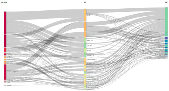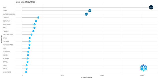 Figure 12 illustrates the countries where the highest number of citations were recorded for articles by their own researchers. As anticipated, the United States stands out with the highest number of citations at 16,127, reflecting an average of 17.40 citations per article. China follows with 8450 citations and an average of 12.60 citations per article, while the United Kingdom has 8015 citations, yielding an average of 14.10 citations per article. These figures underscore the strong impact and recognition of research contributions in the field of Cybernetics originating from these nations.