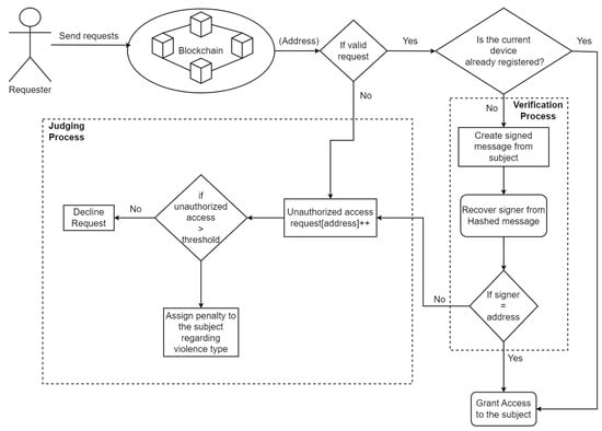 A rogue device might disrupt the IoT network’s operation and result in disastrous outcomes. The IoT environment is battling problems with heterogeneity, integrity, resource limitations, availability, privacy, and security susceptibility [10]. In addition, authentication and access control are the first lines of protection because they only allow individuals with the necessary rights to access data [11,12]. To guarantee data security and integrity, secure IoT systems require reciprocal permission between IoT devices and other networks [13,14,15]. If not, these systems will be vulnerable to various security issues, such as unauthorized access, data theft, and data modification [16,17,18,19]. Due to the heterogeneous nature and distributed architecture of IoT networks, establishing authentication between diverse IoT devices involves complex and varied rules and regulations. Maintaining this with the aid of third-party authorities presents significant challenges, including issues of trust and potential bottlenecks. Further, there are several access control mechanisms in the state-of-the-art works. For example, usage control model (UCON), organizational-based access control (OrBAC), capability-based access control (CapBAC), role-based access control (RBAC), and attribute-based access control (ABAC) have been utilized in the literature [20]. role-based access control (RBAC) refers to managing user access to resources based on their roles [21]. The attribute-based access control (ABAC) is a logical access control paradigm that controls the access between subjects and objects by the properties of entries, operations, and related environments [22]. In conventional security systems, these access control mechanisms are implemented using centralized architectures, which are susceptible to single-point failures, scalability challenges, lower reliability, and reduced throughput. To address this issue, at present, researchers have sought blockchain technologies, which have only recently emerged, to successfully provide a solution to improve scalability, privacy, security, validity, and reliability. Blockchain is a decentralized platform where every transaction is carried out decentrally [23,24].