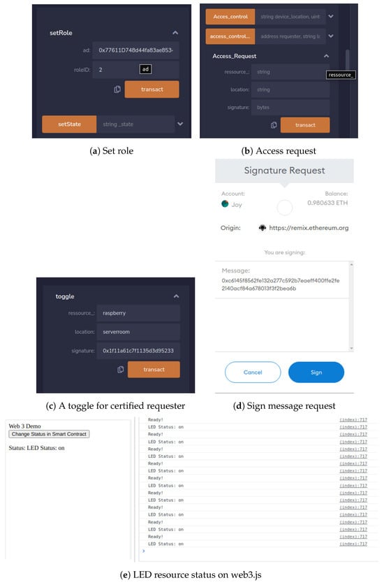 As depicted in Figure 6, our study used two laptop computers (Dell Vostro 356 500, Asus VivoBook S14) and one NodeMCU board-integrated LED board. The NodeMCU board is selected due to its compatibility with IoT projects, cost-effectiveness, strong open-source community support, integrated Wi-Fi, and scalability. Table 5 lists the technical specifications of these devices, and Table 6 indicates the software tools used for the case scenario. The laptops are the user devices in the system, while the LED board is the object. We took into account the issue of access control between the subjects and the objects. We used the Remix integrated development environment (IDE), a browser-based IDE for Solidity (the programming language for developing smart contracts) to write and compile the smart contract. Additionally to this, we made use of web3.js (the official Ethereum JavaScript API) at the object level to communicate with the associated geth client via HTTP connections to deploy and also monitor the state of our code ( i.e., the results of the access control). Additionally, on the subject side, the web3 was set up to communicate with the geth using transactions to submit access requests to the ACP and to get access control responses from the smart contract.