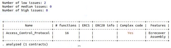 To this end, we employed Slither, a static analysis framework designed for smart contracts, to identify vulnerabilities within our code. This tool can also facilitate code optimization and scrutiny. Following the analysis of our contract code with this tool, the results are depicted in Figure 7. These results indicate that our code exhibits two low-level issues, with zero medium and high-level issues identified. Slither attributed the low-level issues to problems related to built-in symbol shadowing. Importantly, these issues have no adverse impact on the code’s efficiency or the security of our smart contract.