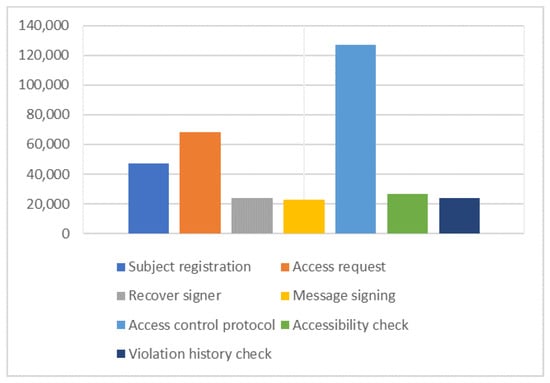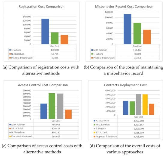 Figure 9d compares the contract deployment and overall cost of various authentication and access control approaches. The present approach’s overall deployment costs exceed the default 3,000,000 gas in the remix. However, the proposed method is within the default gas limit of 3,000,000 gas in remix and considerably less than other existing frameworks. For example, attribute-based access control for IoT systems developed in [45] required about 5 million gas, nearly double the amount required by our approach. Based on the costs, our proposed framework is clearly more lightweight than existing solutions.