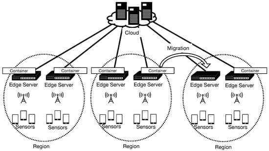 On an Internet of Things (IoT) application, data from sensors and devices are collected and stored data in the cloud via edge servers [,,]. These edge servers handle a large volume of data including data containing personal information. The pre-processing at the edge server is performed before storing the data in the cloud, which reduces the volume of data and converts the data into data that will not be associated with individuals. Pre-processing is indispensable for handling large amounts of data at high speed. Pre-processing is performed at the edge server, as an IoT application service, that covers a wide area and located near the IoT sensors/devices. Conducting experiments with thousands of sensors and/or devices can only be realized using virtual machines or containers in a virtual environment. Furthermore, migration of virtual machines or containers is essential for the efficient operation of virtual environments in edge computing environments (Figure 1).