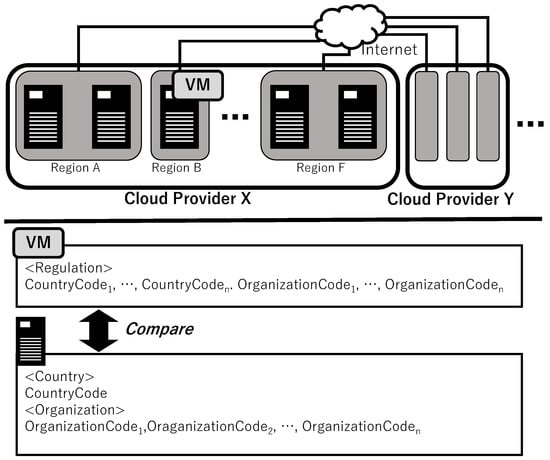 To solve the problem of the inappropriate migration of data contained in virtual machines, we proposed a data-audit control mechanism based on policies (Figure 3). The virtual machine administrator writes a list of identifiers of countries and organizations that can be migrated based on the regulations attached to the data in the virtual machine in the REGULATION. <CountryCode> in the REGULATION indicates the countries where data movement is permitted based on regulations. <OrganizationCode> in the REGULATION indicates the organization that instantiates and uses the virtual machine. The host machine administrator describes the country location of the host machine in COUNTRY and the organization that manages the host machine in ORGANIZATION. When the migration is executed, the REGULATION of the virtual machine to be migrated is compared with the COUNTRY and ORGANIZATION of the host machine to be migrated. First, it checks whether <CountryCode> in the REGULATION contains the COUNTRY of the destination host machine. Similarly, it checks whether <OrganizationCode> in the REGULATION contains the ORGANIZATION of the destination host machine. If both checks pass, this signifies that the data acquired by the virtual machine can be migrated to the destination host machine and migration is executed. Migration execution uses an existing migration process. These mechanisms avoid unintentional data breaches caused by data migration under the terms and conditions granted by the various owners of the data, national laws and regulations, and organizational policies.