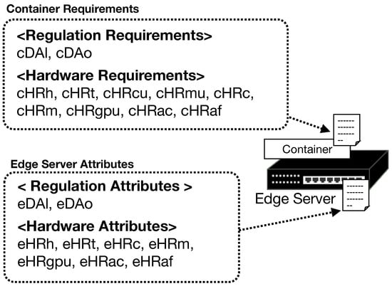 The improper movement of data is a serious concern in containers and virtual machines migration. Therefore, we propose a policy-based data-audit control mechanism for container migration by extending our data-audit control mechanism for virtual machines. Unlike host machines, the edge server does not have abundant resources, requiring hardware requirements/attributes. Therefore, our proposed mechanism adds the regulation requirements/attributes and the hardware requirements/attributes to the data-auditing policies. The regulation requirements/attributes checks whether the data can be migrated in a software manner and the hardware requirements/attributes check whether the data can be migrated in hardware. At the container, the container owner writes the container requirements based on the container’s application and data conventions. At the edge server, the edge server owner describes the edge server attributes (Figure 4). When a container is to be migrated, the container requirements are compared with the attributes of the destination edge server to determine whether the migration is feasible. The migration shall be performed if the destination edge server satisfies the requirements at the container (Figure 5).