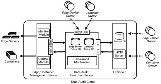 This section described the design of the system that implements the policy-based data-audit control mechanism. By adding a new data-audit cloud unit to the existing edge computing environment of edge servers and containers, the data-audit control mechanism can be utilized during container migration, shown in Figure 6. The data-audit cloud unit includes an Edge/Container Management Server, a Data-Audit Execution Server, and a UI Server. The Edge/Container Management Server runs the Monitor Module for monitoring the edge servers and containers and the Control Module for operating the edge servers and containers. The Data-Audit Execution Server runs the core mechanism for the data audit and other processes, such as the approval or disapproval of migration, are performed by this server. The Data-Audit Execution Server contains a database that stores the edge server Policy and Container Policy used for the data audit. The UI Server allows the edge server and container owners to use the data-audit system visually. The Execution Server communicates with the Data-Audit Server via the REST API.