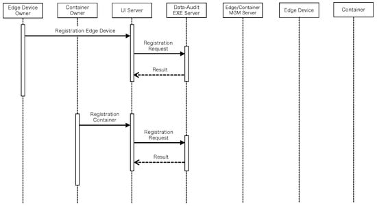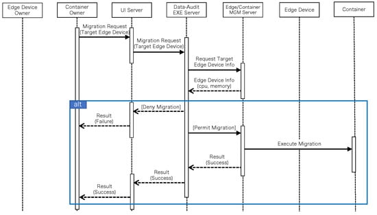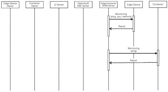 Figure 7 shows the flow of registering information on existing edge servers and containers to the data-audit control system using the UI Server. The edge server owners register their edge servers with the UI Server. The registered information is stored as a policy in the edge server Policy database in the Data-Audit Execution Server. The container owners register their containers and policies with the UI Server. The registered information is stored in the Container Policy database in the Data-Audit Execution Server and the Edge/Container Management Server monitors the registered edge servers and containers every 10 min, as shown in Figure 8. For the edge servers, it obtains the CPU and memory utilization and survival checks. For containers, only survival checks are performed. The flow of the data audit during migration is shown in Figure 9. The container owner sends a migration request along with the target edge server to the UI Server, which sends a request to the Data-Audit Execution Server for the target edge server and the migration. The Execution Server requests information about the target edge server from the Edge/Container Management Server and receives CPU and memory utilization. The data-audit mechanism uses these values. If the data-audit results do not permit migration, a failure notice is returned to the container owner. If the migration is allowed, the migration is executed via the Edge/Container Management Server. A success notice is returned to the container owner.