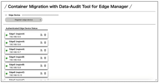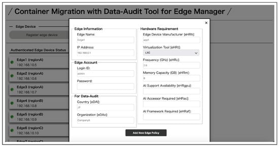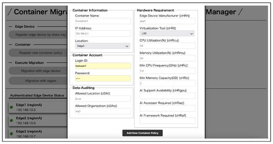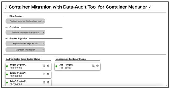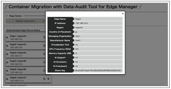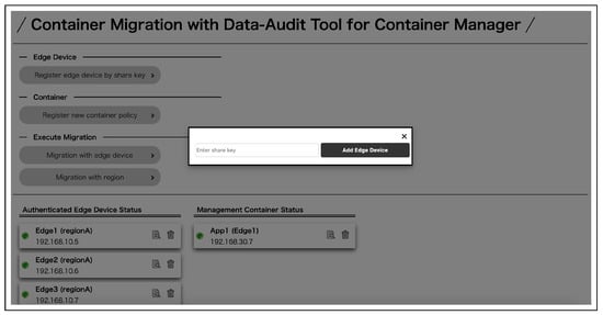 Container owners can register their own containers to check its status in real-time and perform migration between the edge servers in which they were registered and permitted to manage. First, a user registers as a container owner. After that, the user logs in from the login page and moves to the top page of the container owner. On the top page, a list of permitted and registered edge servers and containers managed by the container owner can be viewed (Figure 14). The edge server registration from a share key is shown in Figure 15 and the container registration in Figure 16. Migration execution can be performed by clicking the buttons. The authentication details of each can be viewed by clicking on the edge server and container icons (Figure 17). To execute the migration, select the container and the edge server to be migrated and start the migration process. During the migration process, a data audit is performed and the migration is executed if the conditions are met. After the migration is executed, the information in the list of containers in the migration destination is updated.