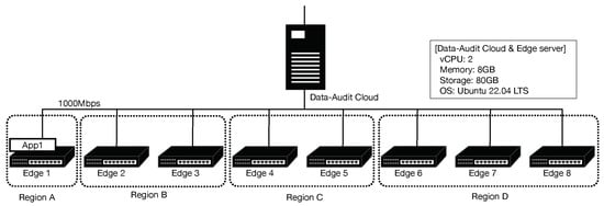 We implemented an edge computing environment consisting of multiple edge servers divided into multiple regions. All edge servers are assumed to be running LXC and running container-generated applications. The CRIUs are deployed at all edge servers so containers can be migrated between the edge servers. Furthermore, the components to realize the proposed data-auditing policy are installed to all the edge servers. The implementation environment is shown in Figure 18.
