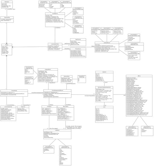 The model is characterized by a large number of entities and a significantly lower number of relationships (45 entities and 18 relationships). Such a prominent imbalance suggests the presence of architectural deficiencies in the diagram such as incomplete representations of relationships and entities. In fact, Figure 1 shows 17 nested classes that are not defined as separate entities connected with relationships to their owner class. Instead, they are only listed within the owner class (Figure 1, Comorbidities class). This manner of partial representation is leaving a large number of relationships hidden. Taking all classes with impartial definitions and defining them properly would add another 17 relationships to the diagram. Thus, the actual simplicity of the diagram would be much lower than what the eye meets since the actual value of the E + R metric is not 63 (E = 45, R = 18) but 90 (E = 45, R = 45). In turn, this shows a high level of ambiguity due to improper use of UML diagramming rules.