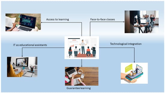 In the figure, the elements that are established as fundamental to executing a hybrid education model are observed. The teacher has multimedia devices that allow him to connect computers and other end devices without wasting time, as well as reproduce the audio and the image with great quality and with greater comfort. In addition, in the LMS, the integration of learning methods and techniques, such as gamification, helps to understand the different subjects of study in an innovative and didactic way. The implementation and integration of ICT to the environment and the LMS have adapted without major complications and its implementation is feasible. However, other factors must be considered that represent a greater challenge for ICTs, such as academic support and the quality of learning. These factors are usually a task that the teacher oversees, which is an important part of the process that these tasks require [17]. In face-to-face teaching, performing this task for a teacher is feasible due to the control that this generates within the group, which can capture all the events that happen in the classroom and make decisions that help students to solve any doubts or problems in the classroom in real time.