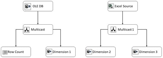The data extraction is done through an ETL process, and several tools allow the design of these processes. The tool used in this work is Microsoft SQL Integration Service. This tool, in addition to its functionality, is graphical, which means that its application does not require excessively deep knowledge on the part of the user. This does not imply that the tool only has basic operations; on the contrary, within its transformation components, it presents several options for a granular transformation of the data. Figure 2 shows one of the processes used for data extraction and transformation. In the segment shown on the left, the source is a transactional database, for which integration services handle an “OLE DB” data source in its tools. This tool allows one to generate a connection string with the desired database and choose the table from which the data is extracted. For the method, in addition to extracting data directly from the different tables, Query is also used to allow the data from different tables to be joined or to perform certain transformations on the data, such as the elimination or transformation of null values. In addition, in the process presented in the figure, a multicast transformation is applied to distribute the data input to two outputs [21]. For this, a conditional split is applied in the transformation to route the data rows to different outputs. In the first output, the data is routed to a few rows, and this information will be useful for storing the number of rows inserted in a dimension. The other destination of the data is the dimensions of the Datamart, which serves as a multidimensional data warehouse. In the right-hand segment of the figure, the ETL extracts the necessary data from an Excel file. This may be a survey or additional student data that has not been aggregated into traditional systems.