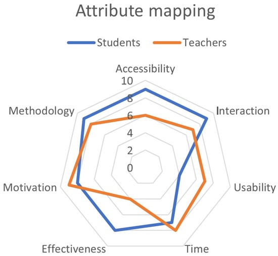 The data sources that are part of the university are varied, as it has several academic and financial systems that are stored in relational databases. As the LMS uses the Moodle platform with a relational database in MySQL, other systems are currently part of the academic environment, such as videoconferencing platforms and gamification tools. In this study, the data stored in Moodle has been considered the main source of analysis, considering that the LMS is the main tool for recording all academic activities [31]. In 2021, several surveys were carried out on both academic staff and students to collect data on the experience of using the IT tools integrated into education, as well as the feelings of students about the hybrid modality that had been executed in the year. The categories or attributes in which the survey is aligned are accessibility, interaction, usability, time, effectiveness, motivation, and methodology.