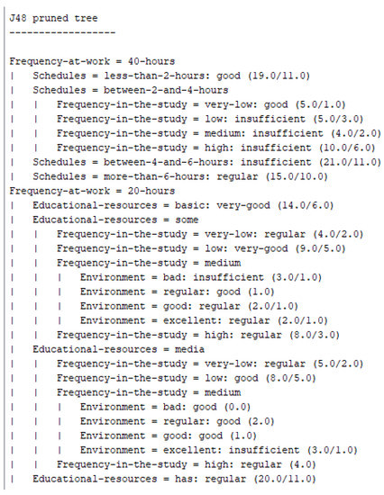 For the analysis, it is important to identify the factors that have the greatest impact on learning and present them to those in charge of academic monitoring. To determine these factors, the tree generated by the J48 algorithm is verified, where learning marked as A, B, and C are considered levels where the student generates knowledge. In processing, the following factors with greater influence on learning are identified: