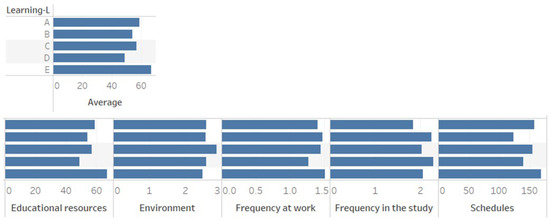 Figure 9 processes these, and they are presented in six groups. The first refers to the level of learning, the second to academic resources, the third to the learning environment (technology, availability, place), the fourth to the frequency of student work, the fifth to the frequency of study, and the sixth to the student’s class schedules and available time. Each group consists of five indicators on the “y” axis. These indicators group the students who have obtained or given an assigned importance value as follows: