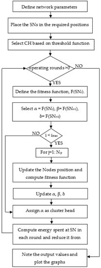 There have been many energy-efficient clustering protocols based on the GWO algorithm proposed in the recent times towards optimal CH selection [16,17]. GWO-based methods are proposed for energy optimizations in WSNs by finding the optimal positions of SNs to achieve maximum connectivity and coverage. It has been shown that the GWO-based CH selection algorithm performs better than PSO, GA, and Greedy approaches [18,19]. Precision improvement of the SN positions improves the data transmission among SNs in the network, saves the node’s energy, and also enhances the network lifetime [20].