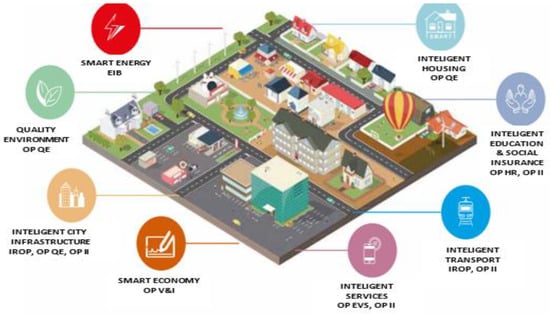 Figure 1 shows the areas of smart solutions and funding schemes in the form of different operational programmes []: Smart Energy (SE), Quality environment (QE), Intelligent City Infrastructure (IROP, OP QE, and OP II), Smart Economy (R&I), Intelligent Services (OP EVS, OP II), Intelligent Transport, Intelligent Housing, Education and Social insurance (OP HR, OP II).