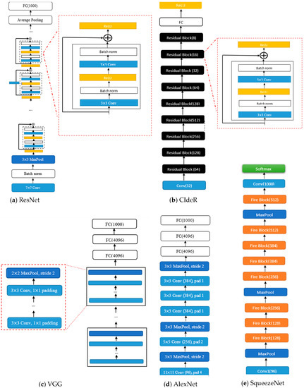 Figure 1. (a) ResNet structure, (b) CIdeR CNN structure, (c) VGG structure, (d) AlexNet structure, (e) SqueezeNet structure. It is noted that “Conv”, “pad”, and “norm” are abbreviations for convolution, padding, and normalization, respectively. - (2)