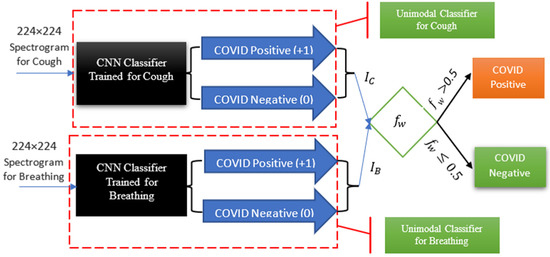 Multi-modal Classification Module: the primary function of this module is to classify the spectrograms generated from the audio inputs into either the COVID-positive or COVID-negative category. This module, as illustrated in Figure 5, encompasses both the trained CNN models, the implementation of which will be described in subsequent sections, and our weighting function for multimodal detection.