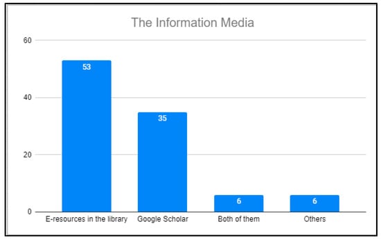 Based on the questionnaire results, the information media that respondents often use are electronic resources in the library. As many as 53 of respondents often use e-resources from the library, 35 use google scholar, 6 use both the electronic resources in the library and google scholar, and 6 use other media. The results for information media are shown in Figure 2.