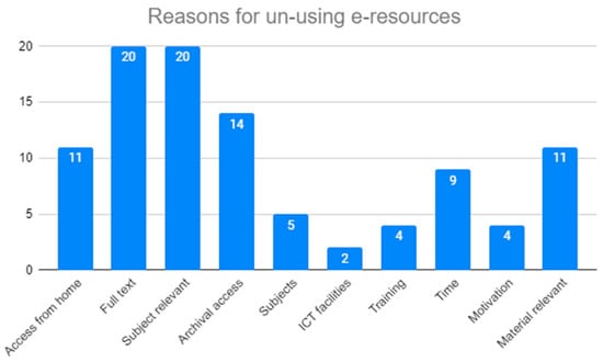 Based on the questionnaire results, it is known that 20 respondents do not use electronic resources in the library due to the lack of full text and lack of relevant material in some databases. A total of 14 respondents stated a lack of access to archival material, and 11 noted the inability to access databases from home and the lack of materials related to their subject (Figure 5).