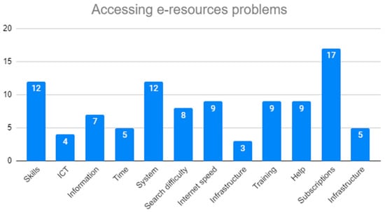 Based on the questionnaire results, it is known that 17 lack subscriptions to more foreign journals, 12 stated that the system is too complicated to use, and lack the skills and knowledge to use electronic resources, and nine stated they lack expert help and support. The results for problems accessing e-resources is shown in Figure 6.