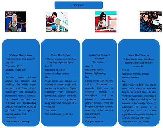 Persona is a method that can communicate individual dimensions in a system, software, or product design [5]. The benefits of personas are confirmed by researchers in the field of human-computer interaction (HCI) [6,7,8,9]. As a method in user experience [10,11,12], personas help understand the point of view of users. So far, the end user has preconceived notions about what the user wants. End users assume that prejudice is a mental representation of users, arguing that data is taken from real data, whereas data about who users are, why users use products, and what can be done in the future can cause friction between user segments and actual users. In addition, the outcome of the decision is not user-centered. Personas accurately describe reported user factual data and can reduce information gaps about users because they include user attributes and interests [13].