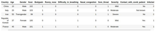 It also contains demographic and clinical data divided into twelve variables including: Country, Age, Gender, Fever, Bodypain, Runny_nose, Difficult_in_breathing, Nasal_congestion, Sore_throat, Severity, Contact_with_covid_patient, and Infected as well as 2500 entries. These data cover about 2500 persons.