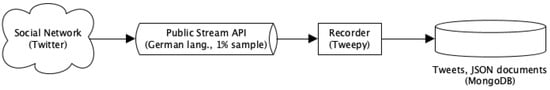This study recorded a Twitter event stream (see Figure 2) using the public Twitter streaming API using the Python library Tweepy [29] and the document store database MongoDB [30]. This approach has been successfully used in previous studies [31] of the author.