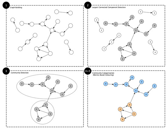 The basic workflow of detecting echo chambers by analyzing Twitter retweets followed the procedure shown in Figure 3 using an example graph for illustrative purposes. The reader should consider that millions of interactions were captured in the context of this study, and the graphs become correspondingly complex. The algorithm was inspired by approaches like [34,35,36,37].