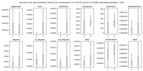 There are countless metrics to measure graphs [41]. The NetworkX library provides Pagerank, and HITS for link analysis and several centrality measures such as closeness, harmonic, betweenness, degree, Katz, information, or load centrality. This paper will not go into detail on all of these metrics. Still, these metrics were examined to determine which are particularly useful in reliably distinguishing the characteristics of two communities. The reader can find these results in Figure 4.